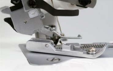 Messer und der Kettelfinger bewegen sich an Ihrer MO-1000 miteinander, so dass nicht nur wie herkömmlich die Schnittbreite, sondern auch die Stichbreite verändert werden kann. Überschnitte und Unterschnitte können so ganz leicht vermieden werden. Bei geschlossenen oder röhrenförmigen Kleidungsstücken kann das Messer ganz einfach und schnell mit Hilfe eines Schalters weggeschalten und wieder zugeschalten werden. Dadurch dass sich das Messer nicht ganz versenkt, kann es als Führung genutzt werden. Somit können Sie ganz einfach die Stichbreite an Ihrer MO-1000 einstellen.