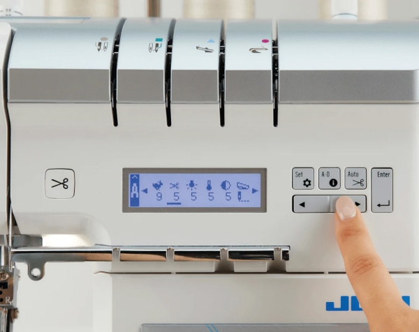 Die JUKI MO-3500 ist mit einer automatischen Fadenzufuhr ausgestattet. Sie passt sich genau der von Ihnen ausgewählten Materialstärke, Stichlänge, Messerbreite und natürlich dem gewählten Stich an, und liefert dementsprechend die benötigte Fadenmenge. Somit entfällt die Fadenspannung manuell einzustellen.